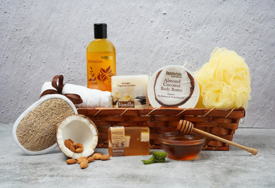 This hamper comes in a solid cane basket along with a beautiful brown ribbon on top. The hamper includes 7 products - Almond Coconut Body Butter (200 grams), Vanilla Shower Gel (200 ml), Honey & Almond Bathing Bar (100gm), Vanilla Scented Candle, Terry Towel, Natural Loofah & Bath Puff.
