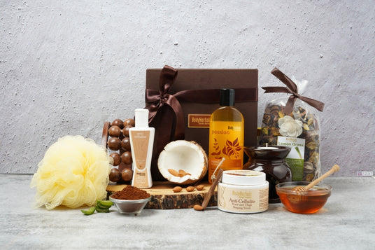 This hamper comes in a solid brown box with a beuatiful brown ribbon on top. It includes 8 products - Vanilla shower gel(200ml). Apricot body massage oil (65ml). Coffee olive vitamin-E body scrub(125g). Body roller massager, Bath puff, Aroma diffuser, Lemongrass potpourri and 2 Aroma t-lights.