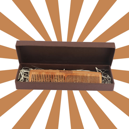 Normal Plastic combs have sharp edges which may damage your hair cuticle and may cause split ends. To maintain healthy hair Neem wood combs are recommended. Neem in its natural form is used to make these miraculous combs which are a solution to all hair problems. These combs are hand crafted so that the points are not too sharp and you can get an excellent stimulating affect as the comb teeth glide over your scalp. Comes in a solid brown box with artificial grass inside.