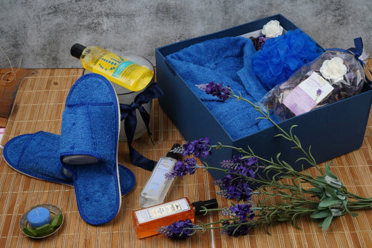 This set includes 9 products - Blue bathing robe, Blue spa slippers, Lavender shower gel (200 ml), Lavender Skin toner (100 ml), Lavender and Vanilla body oil (100 ml), Bath puff, Aroma diffuser, Aroma potpourri & 2 t-lights.