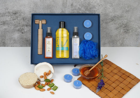 This hamper comes in a solid blue box with a beautiful blue ribbon on top. The hamper includes 6 products - Lavender Shower Gel (200 ml), Lavender Facial Mist (100 ml), Lavender And Vanilla Body Oil (100 ml), Wooden Massager, Bath Puff & 2 Fragranced Tea Lights.