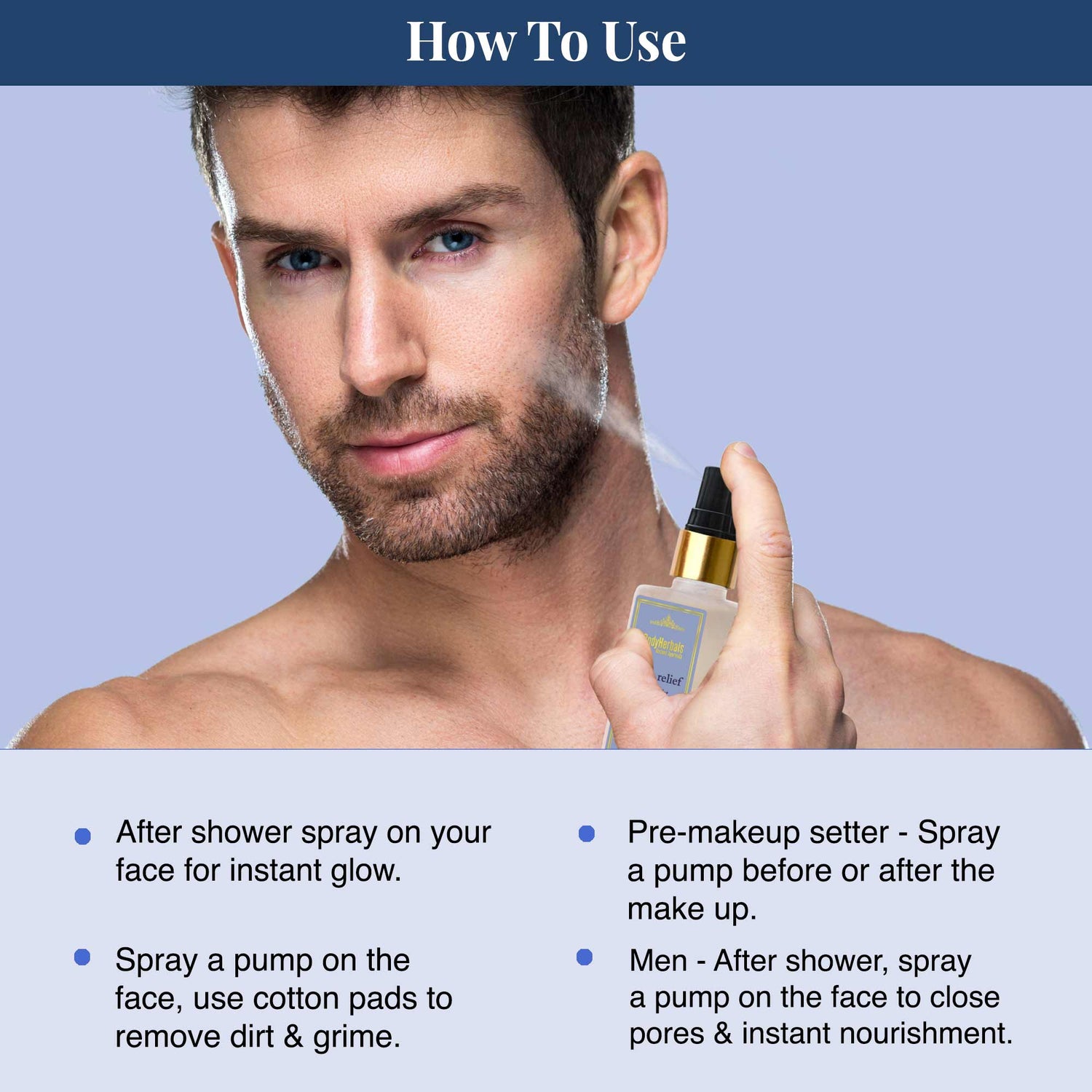 After a shower just spray the mist over your face. It is a pre makeup setter. You can apply makeup on this and the skin will glow. It can be used by men, just after shaving to close pores and for instant nourishment. It can be used to remove makeup, dirt and grime. Just spray a pump on the face, use cotton pads to remove all the impurities. The toner is essential for everyday skin care.