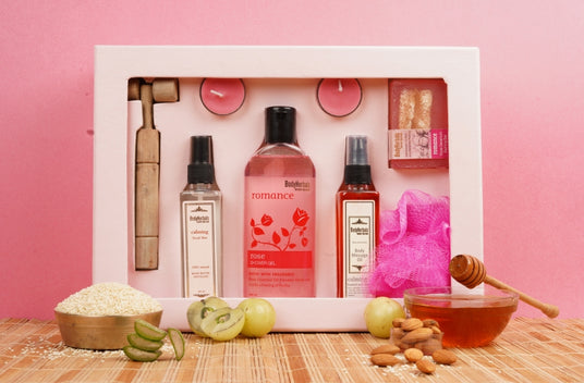 The set comes in a solid pink box along with a beautiful pink ribbon on top. It includes 7 products - Rose Shower Gel (200ml), Rose Geranium Soap (100gms), Rose Facial Mist (100ml), Rose Body Oil (100ml), Wooden Massager, Bath Puff and 2 Fragranced Tea Lites.