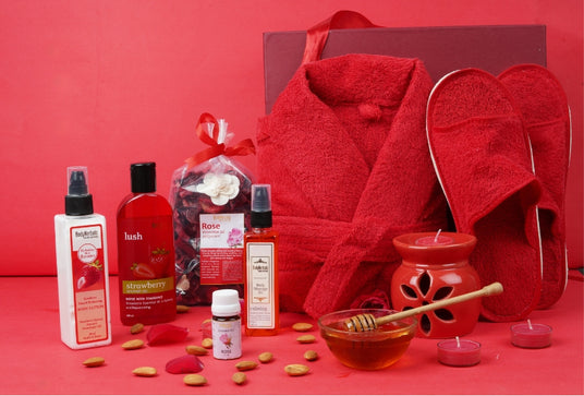 This hamper comes in a big red box with a beautiful red ribbon on top. The hamper includes 8 products - Red Bathing Robe Set, Strawberry Shower Gel (200ml), Strawberry Body Lotion (200ml), Rose Geranium Body Oil (100ml), Aroma Diffuser, Rose Potpourri, 7)Bath Puff and 2 Tea Lites.